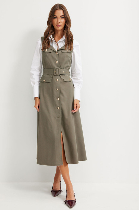 Сарафан полуприлегающего силуэта расширенный книзу из плательной ткани. Горловина с фигурным вырезом, с застежкой по центру на петли и пуговицы. Платье отрезное на линии талии. По переду на лифе нагрудные вытачки, на спинке – талиевые. По переду декоративные клапаны. В комплект входит пояс из основной ткани. Обращаем ваше внимание, что фурнитура может отличаться от фото.