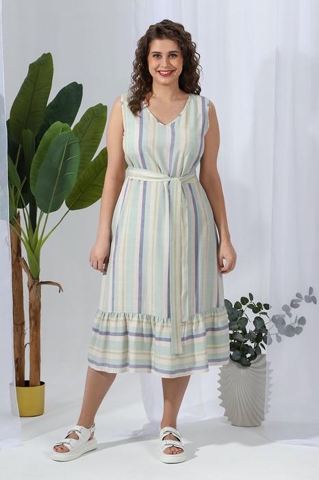 Сарафан из штапельной плательной ткани с набивным рисунком в полоску, без рукавов, с V –образной горловиной, широкой оборкой по низу. Верхние срезы оборки присборены по швам стачивания с изделием. На полочке в области груди обработаны две вытачки, горловина и проймы окантованы основным материалом.