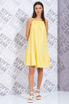 Платье отрезное по линии талии, на бретельках с регуляторами, выполнено из натурального льна. Лиф прилегающего силуэта, с фигурным вырезом в области линии талии. Застежка на потайную молнию в боковом шве. Спинка частично обработана венгеркой, для комфортной регуляции размера. Юбка А-образного силуэта, с внутренними карманами в боковых швах.