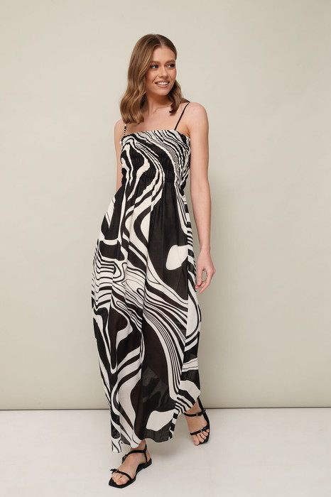 Летнее платье на бретельках с регуляторами, в длине миди. Платье выполнено из натурального хлопка с абстрактным принтом. Лиф прилегающего силуэта, собранный на венгерку, низ слегка расширенный к низу. Платье обработано хлопковой подкладкой.