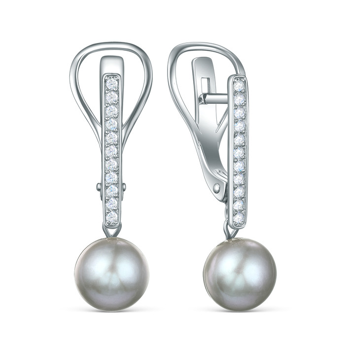 Серьги из серебра с культивированным жемчугом и фианитами родированные 04-702-00