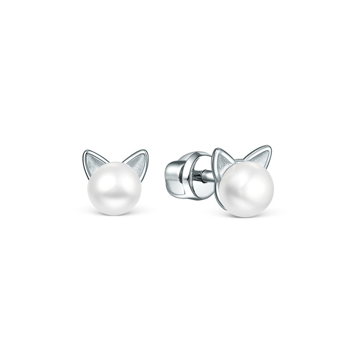 Совместные покупки Омск Ювелирные украшения и бижутерия Серьги — Серьги-пусеты из серебра с культивированным жемчугом родированные - Кошки 925 пр
