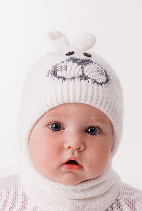 Забавная шапочка для малышей и малышек. Верхний слой связан полушерстяной мериносовой пряжи, нижний слой из хлопкового полотна и полностью пришит. Внутри утеплитель - изософт. Спереди вывязана мордочка зайца, пуговки-глазки. Сверху вручную пришиты небольшие заячьи ушки. Шапочка поместится в любой капюшон. Аккуратные завязки без узлов и наконечников.