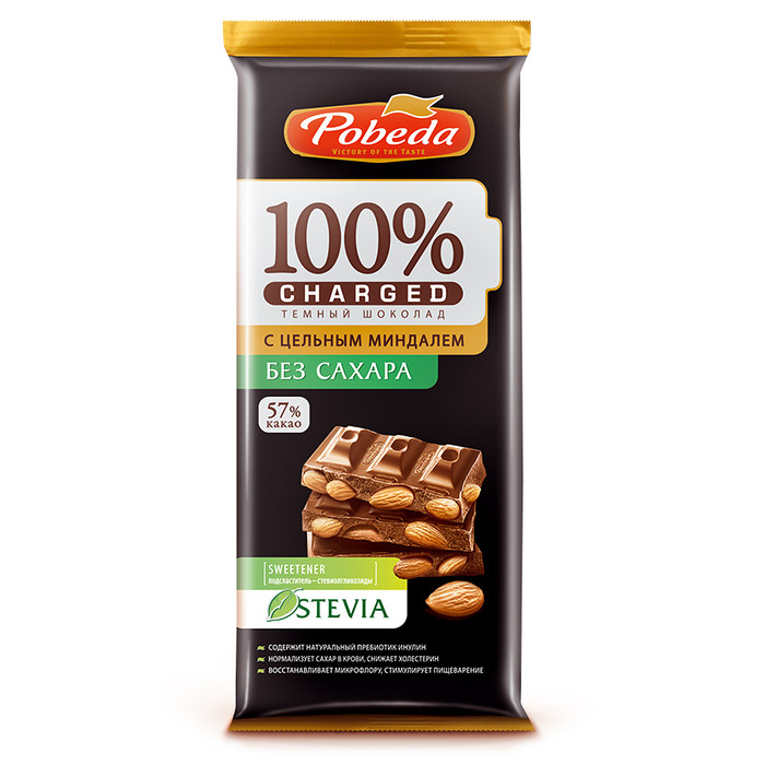 Коллекция «Чаржед» – это умный шоколад нового поколения, в котором традиционная рецептура разработана с учетом современных тенденций.В темном шоколаде Charged с цельным миндалем мы не используем сахар. Вместо него добавлен натуральный сахарозаменитель – стевиолгликозид. Стевиолгликозид – очищенный экстракт растения стевии (Stevia rebaudiana), который придает листьям сладкий вкус. Растение стевия родом из Южной Америки. Это уникальный природный сахарозаменитель, не имеющий аналогов, благодаря особенной сладости и натуральному происхождению. А цельный миндальный орех всегда идеальная пара к шоколаду. Миндаль также содержит витамины группы В и регулирует уровень плохого холестерина. С шоколадом «Победа» без сахара придерживаться ЗОЖ – просто и вкусно.