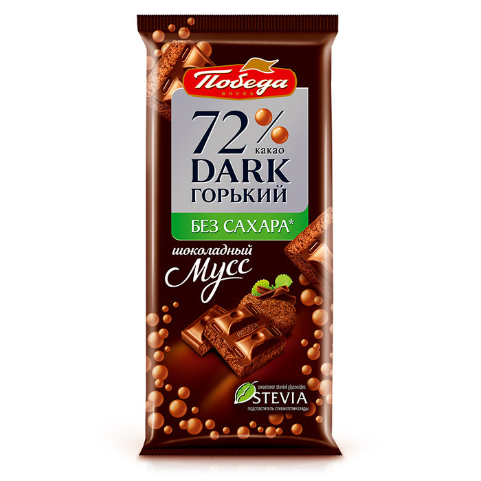Пористый шоколад 72 % какао «Шоколадный мусс» – настоящий полет кондитерской мысли. В этой плитке пузырьки вспененной шоколадной массы сначала расширяются, а затем сохраняются при охлаждении. В результате мы получаем воздушную, нежнейшую текстуру мусса и необыкновенную легкость. В этом рецепте легкости еще больше потому что мы заменили сахар на натуральный сахарозаменитель – стевиолгликозид. Стевиолгликозид – очищенный экстракт растения стевии (Stevia rebaudiana), который придает листьям сладкий вкус. Растение стевия родом из Южной Америки. Это уникальный природный сахарозаменитель, не имеющий аналогов, благодаря особенной сладости и натуральному происхождению. Ваш любимый вкус и еще больше пользы. А в основе – всеми любимый горький шоколад «Победа» 72 % какао!
