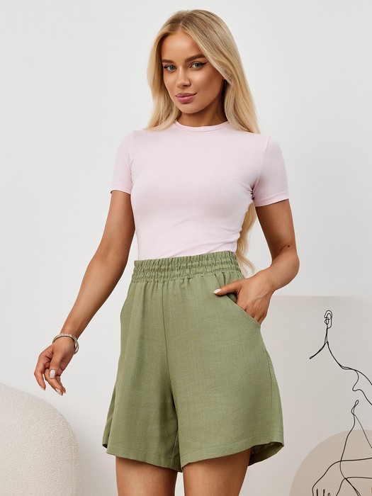 Шорты молодежные из гладкокрашеного тканого полотна «лен-вискоза», свободные, средней длины, на притачном поясе с эластичной тесьмой внутри, карманами в боковых швах.
