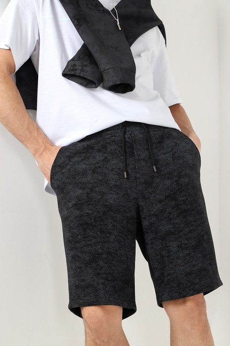 Шорты мужские из трикотажного полотна "футер-трехника -петля", на притчном поясе с эластичной тесьмой внутри, с карманами в боковых швах и имитацией застежки "гульфик". В центре пояса - две обметанные петли, чере которые продет шнурок с наконечниками для регулирования степени прилегания шорт по талии.
