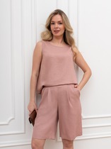 Шорты женские из гладкокрашеного тканого полотна, свободного покроя, средней длины, с карманами в боковых швах, на притачном поясе с эластичной тесьмой внутри.
