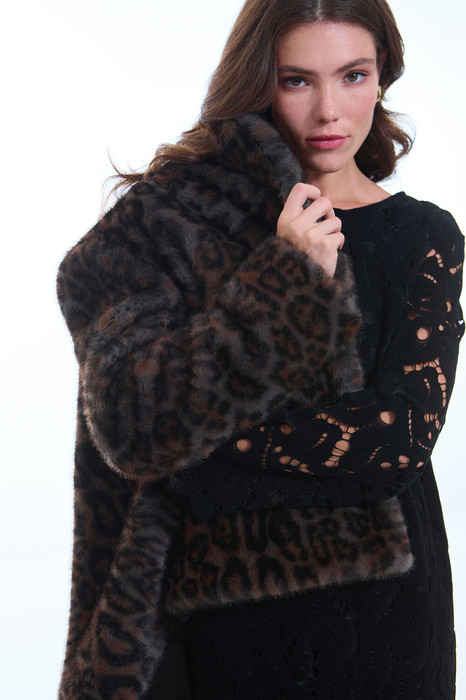 Пальто женское демисезонное, из мехового трикотажного полотна, на подкладке, однобортное, прямого силуэта длиной до середины бедра. Застежка на пришивные кнопки. Перед с функциональными карманами «щель». Рукав длинный, одношовный. Воротник и лацкана отложные.