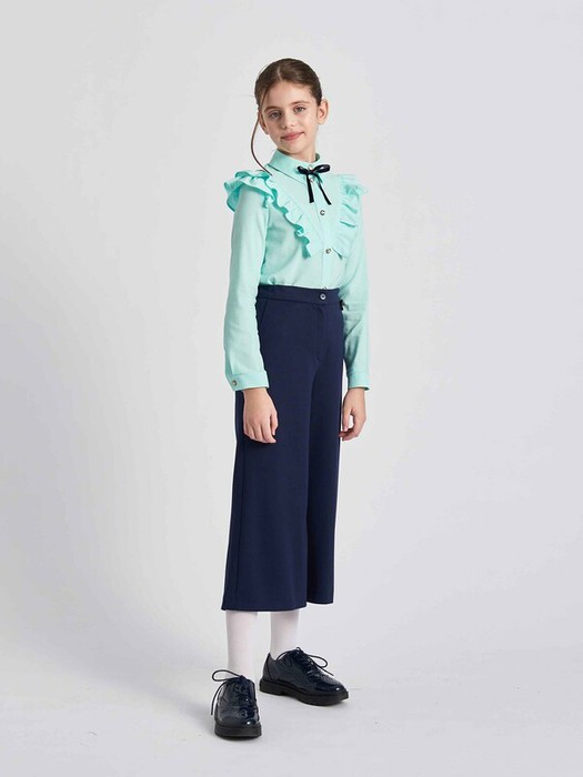 Эффектная блузка для девочки из смесового хлопка полуприлегающего силуэта с отложным воротником и длинными рукавами. Высокое содержание хлопка в составе обеспечивает отличную воздухопроницаемость и комфорт в повседневной носке. Полочка блузки и рукава декорированы оборками из основной ткани. Воротник дополнен небольшим бантом контрастного цвета из бархатной ленты. Центральная застёжка на планку с пуговицами, отличный вариант на каждый день.
