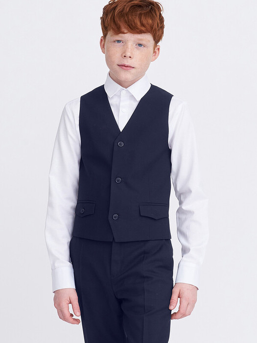 Жилет из смесовой вискозы на вискозной подкладке для мальчика с V-образным вырезом и боковыми прорезными карманами с клапаном и пуговицей. Спинка дополнена хлястиком с металлической пряжкой для регулировки жилета по полноте. Застегивается на три пуговицы.
