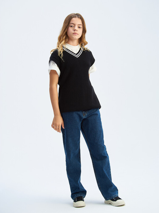 Стильный вязанный жилет унисекс с V-образным вырезом из хлопковой пряжи прямого фасона. Боковые швы дополнены разрезами. Низ жилета, пройма рукавов и вырез горловины оформлены фактурной резинкой, вдоль горловины резинка контрастного цвета. Жилет выполнен из 100% хлопка, что обеспечивает отличную воздухопроницаемость и комфорт в повседневной носке.