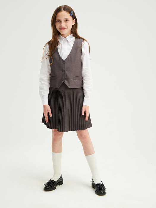 Жилет из габардина на подкладке для девочки. Полочки дополнены двумя прорезными карманами с листочкой. Застегивается на 3 пуговицы. Жилет будет прекрасным дополнением к моделям из школьной коллекций SMENA, отличный вариант на каждый день.