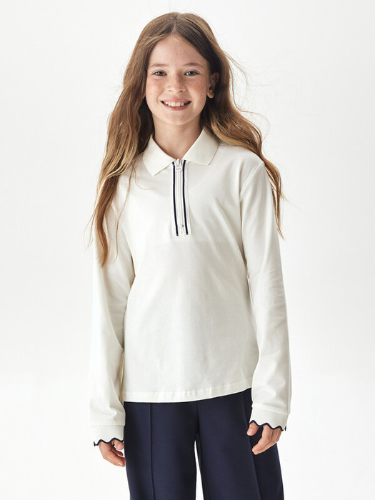 Трикотажное поло для девочки полуприлегающего силуэта с длинными рукавами. Край рукава с манжетами на подвязе и с фактурным краем. Воротник отложной со стойкой. Укороченная застёжка на переде на молнию обеспечивает идеальную посадку.
