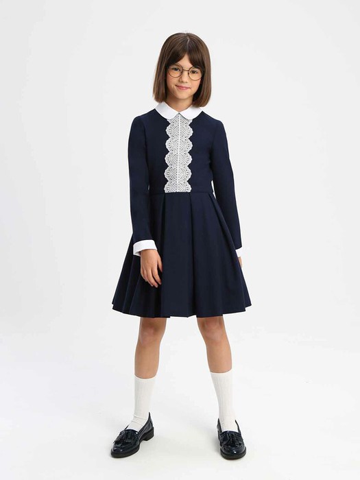 Эффектное платье  А-силуэта со съемнвым воротником, контрастного белого цвета. С длинными втачными рукавами со съемными манжетами белого цвета, и юбкой колокол с мягкими складками. В боковых швах юбки расположены карманы.. Полочка декорирована кружевной аппликацией контрастного цвета Платье выполнено из износостойкой костюмной поливискозы с добавлением эластичных волокон, обеспечивающих комфорт в движении. Потайная молния на спинке - удобная застежка, с которой справится даже первоклашка. В комплекте предусмотрен съемный подъюбник на пуговицах.