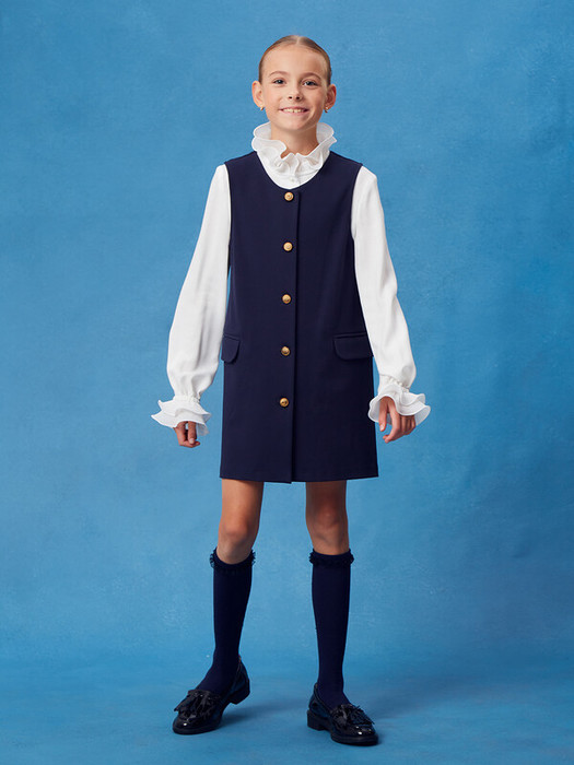 Сарафан из трикотажного полотна, застегивается на металлические пуговицы. Удобный круглый вырез горловины добавляет нотку нежности и подходит к любому типу фигуры. Модель прекрасно комбинируется с различными топами и блузками, позволяя создать множество образов для школьных будней.