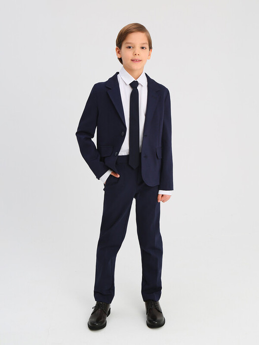 Классический костюм 2-йка для мальчика из трикотажа. Пиджак полуприлегающего силуэта с английским воротником и длинными втачными рукавами. Дополнен прорезными карманами с клапаном. Застегивается на 2 пуговицы. Брюки зауженные на поясе с еврорезинкой сзади. В боковых швах расположены карманы, горизонтальные защипы и застёжка - гульфик на молнии. Сзади расположены карманы с листочкой.