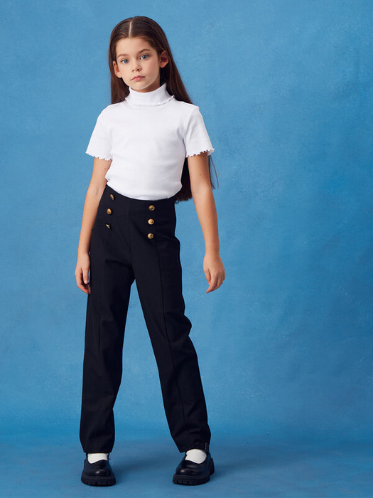 Прямые брюки для девочек изготовлены из немнущейся костюмной ткани высокого качества, которая идеально подходит для брюк данного фасона. Высокая талия и пояс на резинке не стесняют движений. Брюки имеют карманы достаточной глубины. Брюки элегантно смотрятся на девочках любого роста. Декорированы металлическими пуговицами.
