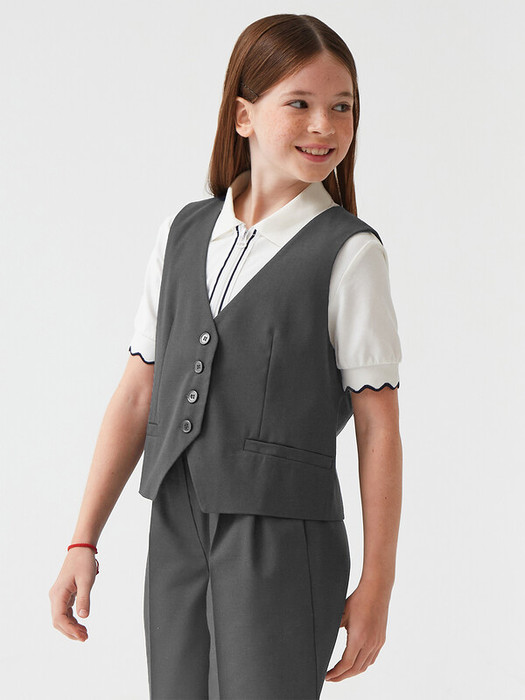 Классический жилет из прочной костюмной ткани. Модель приталенного силуэта с глубоким V-образным вырезом и застежкой на пуговицы. Жилет дополнен декоративными прорезными карманами. Подойдет для создания школьного образа или как топ в сочетании с джинсами и бомбером. Доступен в 2 цветах.