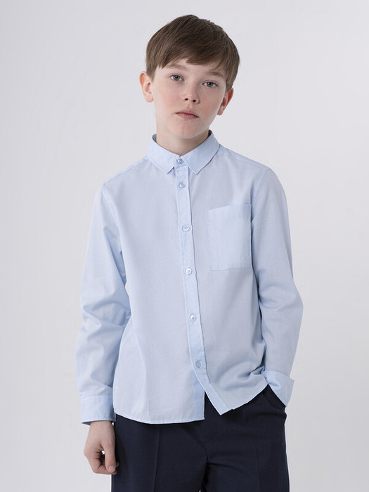 Сорочка для мальчика из смесового хлопка полуприлегающего силуэта. На спинке - кокетка. Воротник отложной со стойкой. Левая сторона полочки дополнена накладным карманом. Застёжка по центру переда на планку с кнопками. Рукава рубашечные со шлицами и манжетами.