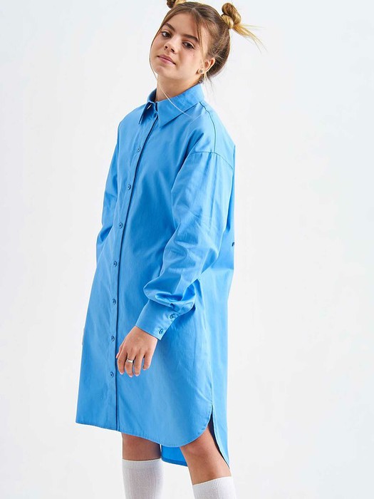 Платье-рубашка из хлопчатобумажной ткани с отложным воротником. На рукавах удлиненные манжеты, карманы в боковых швах, фигурный низ. Стильная модель с разными вариантами ношения, по бокам есть возможность регулировки по ширине изделия, что позволяет менять внешний вид платья: сделать его приталенным, либо  оверсайз.