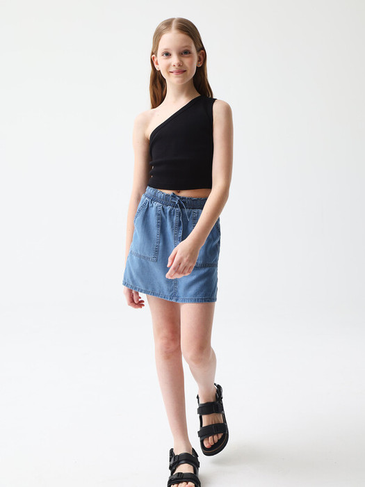 Юбка из лиоцелла прямого кроя. Средняя посадка с широким поясом на резинке. По поясу расположен рулик в качестве завязки, что добавляет комфорта в носке. Крупные накладные передние карманы и задние классические. Размерный ряд 128 – 176 см.