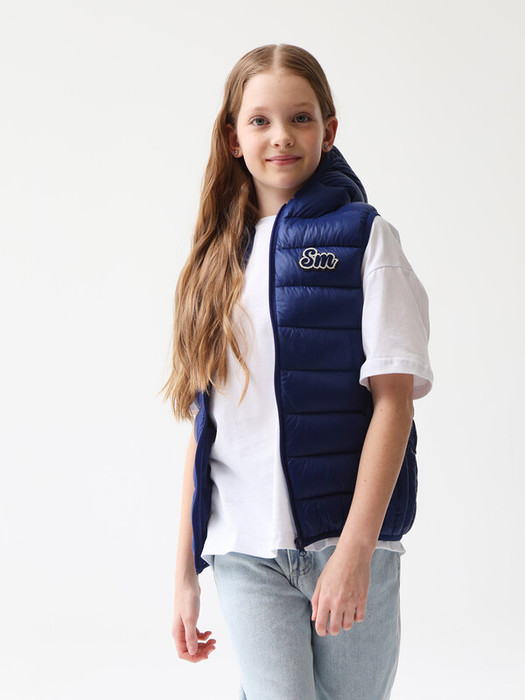 Демисезонный двусторонний стеганый жилет с утеплителем из синтепона, выполненным из экологичных и переработанных материалов. Прямой крой, капюшон и воротник-стойка, застежка-молния. Прорезные карманы на молнии, внутри - флис. На груди фирменный патч «Sm». Размерный ряд 128 – 176 см.