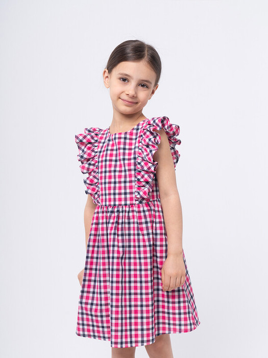 Платье летнее без рукавов из смесового хлопка в клетку. Прилегающий верх и расклёшенная отрезная юбка с мягкими складками делают силуэт неотразимым. Аккуратный вырез горловины подчёркивает красоту шеи. На груди и спике акцентные валаны.