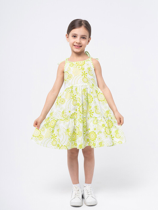 Летнее платье длины миди на тонких регулируемых бретелях из смесевого хлопка. Юбка А-силуэта с валанами. Крой с пышной юбкой позволит быть самой активной. Акцент на талии формирует утончённый силуэт.