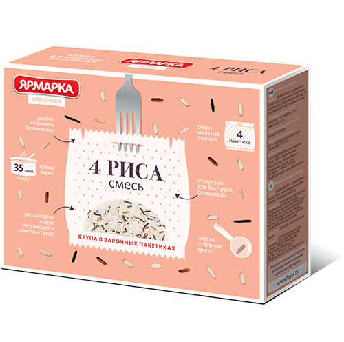 Смесь 4 риса «Ярмарка Отборная» — это оригинальная смесь четырех разных рисов. Простая и универсальная в использовании, отличный вариант для приготовления полезных и питательных гарниров и салатов, прекрасно сочетается с мясом, курицей и рыбой.