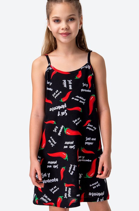 Идеально для самых уютных моментов! Детская сорочка для девочек и девочек-подростков выполнена из натурального 100% хлопка. Аккуратные тонкие бретели, удобный А-силуэт и длина выше колена – каждая деталь создана для комфорта ребенка. Домашнее платье для детей представлено в черном цвете и украшено принтом перцы.