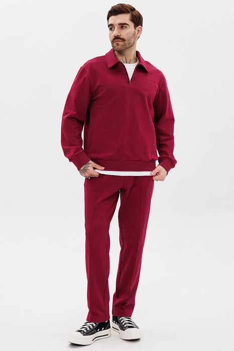 Для образа игрока в гольф не хватает воротничка! Воротник - деталь свитшота с застежкой поло, которая почекнет весь аутфит. Брюки со стрелками добавят образу строгости и деловитости, что позволит носить костюм как на прогулки, так и в офис. Пошит из комфортной ткани - футера 3-нитки без начеса.