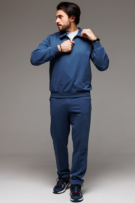 Для образа игрока в гольф не хватает воротничка! Воротник - деталь свитшота с застежкой поло, которая почекнет весь аутфит. Брюки со стрелками добавят образу строгости и деловитости, что позволит носить костюм как на прогулки, так и в офис. Пошит из комфортной ткани - футера 3-нитки без начеса.