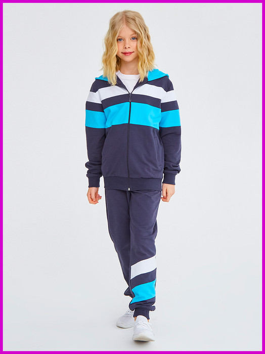 Спортивный костюм выполнен из высококачественного трикотажного полотна.Костюм состоит из куртки с длинным рукавом и брюк на манжете.На полочке олимпийка декорирована вставками из контрасных тканей.