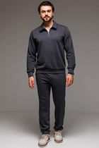 Спортивный костюм из хлопкового трикотажного полотна. Кокетки на куртке выполнены из ткани контрастного цвета. В швах притачивания кокеток проложен кант белого цвета. Карманы на куртке и брюках прорезные с листочками на молнии. Листочки выполнены из полотна контрастного цвета с белыми кантами. Посадку по фигуре обеспечивает эластичная рибана по воротнику, поясу и манжетам. Брюки прямые с накладным карманом на задней половинке. Пояс по линии талии регулируется шнурком. На брюках и полочке настрочен шеврон с фирменным логотипом.