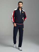 Спортивный костюм из хлопкового трикотажного полотна. Куртка прямая с воротником с фронтальной молнией. Рукава втачные. Карманы куртки прорезные . На груди куртки слева и на левой брючине под карманом - фирменный шеврон.. Воротник, манжеты и пояс куртки выполнены из полосатого эластичного трикотажа. Брюки прямые, с прорезными карманами .Пояс брюк эластичный, по линии талии дополнительно регулируется шнурком.