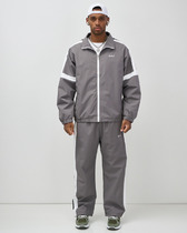 Спортивный костюм из хлопкового трикотажного полотна .Куртка костюма на поясе, с воротником-стойкой, с капюшоном, застегивается на молнию. Рукава втачные. Несколько деталей костюма изготовлены из водонепроницаемой плащевой ткани в тон изделия - это капюшон,кокетка куртки, вставка левого рукава и боковые вставки брюк. Карманы куртки и брюк с молниями, распологаются в рельефах. На рукаве куртки слева предусмотрен дополнительный карман, он также с молнией. Капюшон ветрозащитный, с высокой цельнокроенной стойкой. Пояс и манжеты куртки собраны на эластичную резину. Брюки прямые, зауженные книзу. Пояс брюк по линии талии так же с эластичной резинкой, дополнительно регулируется шнуром. На левом рукаве и под левым карманом брюк нашиты шевроны с фирменным логотипом.