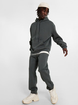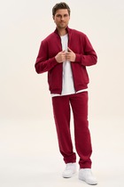 Спортивный костюм из хлопкового трикотажного полотна. Куртка костюма на поясе, с воротником-стойкой, с легким капюшоном, застегивается на молнию. Рукава втачные. Несколько деталей костюма изготовлены из водонепроницаемой плащевой ткани в тон изделия - это капюшон, вставки рукавов, переходящие в плечевые кокетки, бочки куртки, боковые вставки брюк. Ветрозащитная планка из плащевой ткани закрывает молнию. Все карманы комплекта застегиваюся на молнии и расположены в швах боковых деталей, Лицевая часть капюшона регулиреутся резиновым шнуром с помощью металлических фиксаторов.Пояс, воротник и манжеты куртки изготовлены из эластичного подвяза. Брюки прямые, зауженные книзу. Пояс брюк по линии талии с эластичной резинкой так же дополнительно регулируется шнуром. На левой груди и под левым карманом брюк нашиты шевроны с фирменным логотипом