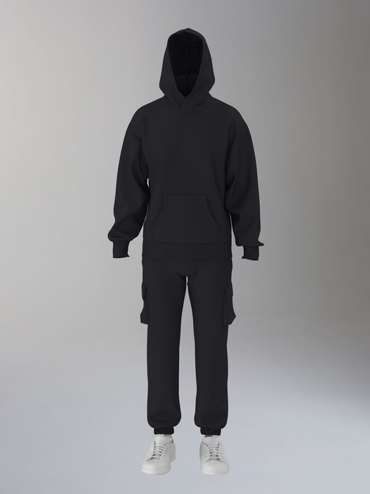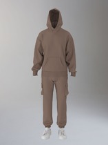 Мужской спортивный костюм из плотного трикотажа с петельной изнанкой. Верх комплекта - толстовка-худи с капюшоном, с накладным карманом "кенгуру". Рукава толстовки втачные, свободные со спущенной линией плеча, с эластичными манжетами. На тактических брюках "Карго" два объемных накладных кармана с клапанамии и еще два кармана в боковых подрезах. Брюки зауженны книзу на резинку. Пояс брюк на резинке, по линии талии дополнительно регулируется шнуром.