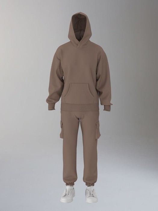 Мужской спортивный костюм из плотного трикотажа с петельной изнанкой. Верх комплекта - толстовка-худи с капюшоном, с накладным карманом "кенгуру". Рукава толстовки втачные, свободные со спущенной линией плеча, с эластичными манжетами. На тактических брюках "Карго" два объемных накладных кармана с клапанамии и еще два кармана в боковых подрезах. Брюки зауженны книзу на резинку. Пояс брюк на резинке, по линии талии дополнительно регулируется шнуром.