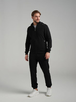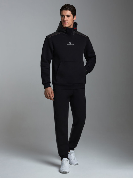 Спортивный костюм с капюшоном, из трехниточного плотного трикотажа с начесом по изнанке. Куртка-худи прямого силуэта. Рукава втачные со спушенной линией плеча. Кокетки куртки, капюшон и нижняя часть задней брючины продублированы водонепроницаемой плащевкой.Карманы накладные "кенгуру". Манжеты рукавов и брючин и пояс куртки из эластичного трикотажа. Брюки с прорезными карманами на молниях, Низ брюк заужен анжетами. Пояс брюк по линии талии с эластичной тесьмой, дополнительно регулируется шнуром.На груди и на брюках под карманом - термотрансфер с фирменным логотипом.