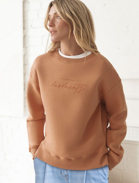 Состав: 80%Хлопок 20%ПЭ Плотность: 320 Г/м2 Параметры модели на первом фото: Рост 170, бюст 89, талия 63, бедра 92Свитшот с круглым воротом выполнен из премиального футера трехнитки с теплым начесом. Модель дополнена фактурным лаконичным принтом. Перевод: «Живи мгновениями». Свободный крой подходит для любой фигуры и впишется в любой гардероб. Сочетается в костюме с брюками D44.129