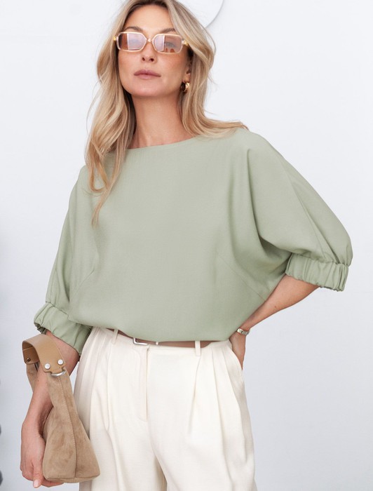Состав: 76%Лиоцелл (Вис) 24%ПЭ Плотность: 180 Г/м2Свободная блузка светло-зеленого цвета выполнена из плотного лиоцелла. Лиоцелл это более дорогой и экологичный вариант вискозы, очень прочный и шелковистый. Современная интерпретация кроя «летучая мышь» дополнена акцентными эластичными манжетами. Эта блузка идеальна для любого типа фигуры, в том числе и на королевские размеры. Этот крой создан для того, чтобы мягко скрыть лишние объемы. Эта повседневная блузка с вырезом лодочка создана для легкого и утонченного стиля. Мягкие линии кроя создают невероятно эффектный образ, который подчеркивает естественную красоту, не стесняя движений, а свободный фасон дарит ощущение абсолютного комфорта и уверенности. Блузка красиво драпируется при движении, создавая летящий, воздушный эффект.
