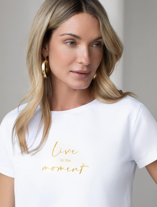 Состав: 92%Хлопок 8%ПУ Плотность: 170 Г/м2Модная футболка белого цвета привлекает внимание своим интересным дизайном и ярким принтом. Благодаря прямому крою изделие комфортно садится на любую фигуру, в том числе на большие размеры, и не сковывает движений. Круглый вырез подчеркивает современный стиль, а натуральный материал из хлопка с добавлением эластана обеспечивает удобство в повседневной носке и приятные тактильные ощущения. Прочность и износостойкая структура сохраняет первоначальную форму футболки после множества стирок. Рукава имеют аккуратные подгибы, что придает изделию завершенность и помогает сохранять аккуратный внешний вид. Принт надписи нанесен красками с устойчивым покрытием, перевод надписи: Live in the moment - Жить в данный момент. Стильная футболка гармонично вписывается в любой гардероб и подойдет для прогулок, отдыха дома или неформальных встреч. Благодаря особенностям кроя модель хорошо сидит, скрывая недостатки и подчеркивая достоинства. Удобная футболка идеально сочетается с базовыми вещами, позволяя создавать новые интересные образы каждый день.