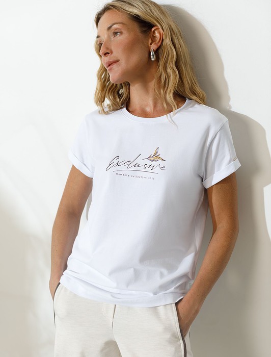 Состав: 92%Хлопок 8%ПУ Плотность: 170 Г/м2Модная футболка белого цвета привлекает внимание своим интересным дизайном и ярким принтом. Благодаря прямому крою изделие комфортно садится на любую фигуру, в том числе на большие размеры, и не сковывает движений. Круглый вырез подчеркивает современный стиль, а натуральный материал из хлопка с добавлением эластана обеспечивает удобство в повседневной носке и приятные тактильные ощущения. Прочность и износостойкая структура сохраняет первоначальную форму футболки после множества стирок. Рукава имеют аккуратные подгибы, что придает изделию завершенность и помогает сохранять аккуратный внешний вид. Принт в виде надписи нанесен красками с устойчивым покрытием, перевод надписи: Exluzive moments collection only - Только коллекция эксклюзивных моментов. Стильная футболка гармонично вписывается в любой гардероб и подойдет для прогулок, отдыха дома или неформальных встреч. Благодаря особенностям кроя модель хорошо сидит, скрывая недостатки и подчеркивая достоинства. Удобная футболка идеально сочетается с базовыми вещами, позволяя создавать новые интересные образы каждый день.