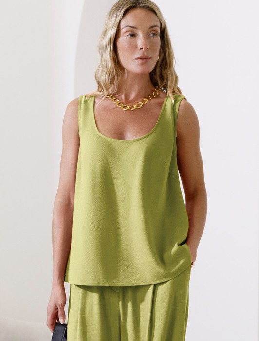Состав: 70%Вис 30%Лен Плотность: 200 Г/м2Лаконичный топ салатового цвета без застежек с U-вырезом выполнен изо льна с вискозой, плотносью 200 Г/м2. Сочетание льна и вискозы обеспечивает комфорт и прохладу в жаркие дни. Свободный топ на широких бретелях будет идеальным выбором для лета и весны, позволяя ощущать комфорт даже при высокой температуре воздуха. Особенность этого летнего топа — шитый по косой, он хорошо драпируется и мягко прилегает к фигуре, создавая струящиеся складки. Свободный крой топа обеспечивает комфорт, легкость и свободу движений, открытое декольте подчеркивает изысканность образа и женственность силуэта. Этот красивый топ подойдет для создания любого стильного повседневного образа, на работу или на важное мероприятие.