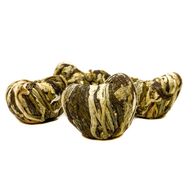 Связанный чай ручной работы. Каждый цветок создан мастерами, вплетающими в листья и почки белого и зеленого чаев соцветия жасмина, клевера и лилии. Чай для ценителей десертов. Тем, кому нравится выпечка с ягодным ароматом.