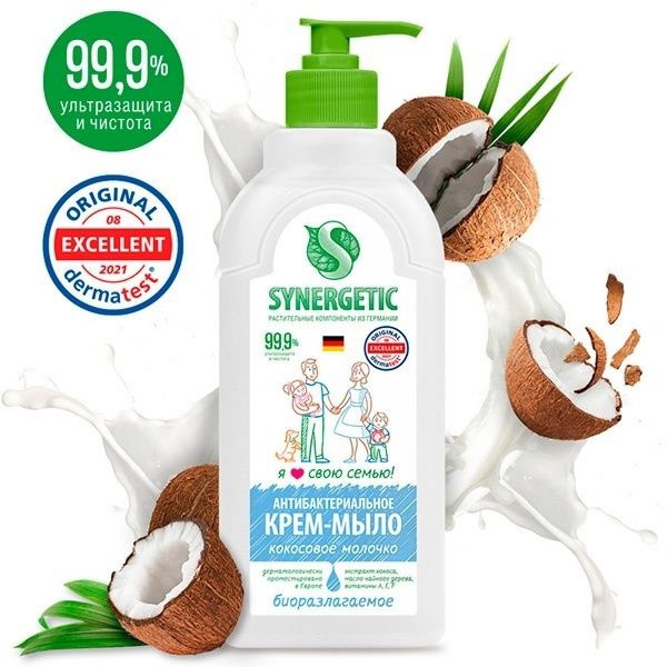 Антибактериальное увлажняющее жидкое крем-мыло "Кокосовое молочко" Synergetic эффективно очищает кожу от любых загрязнений и запахов даже в холодной воде.