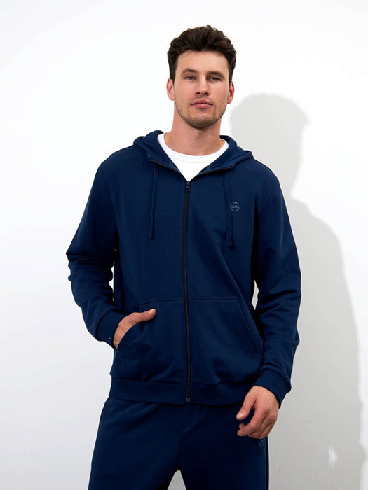 Классическая толстовка на молнии, выполнена из хлопкового полотна с добавлением полиэстера. Мягкая и приятная на ощупь, обладает хорошей гигроскопичностью, позволяет коже дышать. Модель с капюшоном и длинными рукавами не сковывает движений,  обеспечивая комфорт. Объем капюшона регулируется при помощи шнура. Манжеты рукавов и низ толстовки оснащены эластичными резинками. Спереди толстовка дополнена карманом "кенгуру".