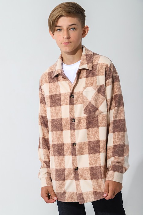 Актуальная рубашка для мальчика. Модель из клетчатого легкого флиса в объеме оверсайз, на пуговицах, с накладным карманом, фигурной линией низа.